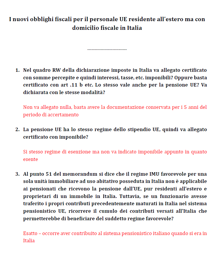 Troverete in allegato un memorandum volto ad illustrare le modifiche recentemente introdotte in merito agli obblighi dichiarativi, ai fini delle imposte sui redditi e patrimoniali, per il personale UE fiscalmente domiciliato in Italia ma residente all’estero
