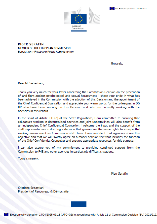 On 12.12.2023, the new decision came into force at the Commission, and we are pleased to see its first positive effects, particularly in relation to the crucial role of the CCC and to the visible strengthening of the role of Confidential Counsellors. This is despite the fact that other actors, particularly those involved in the management of Article 24 cases and the conduct of formal procedures, do not seem to have fully grasped the change in approach and the fact that the new procedures are ultimately focused on the defence of victims .