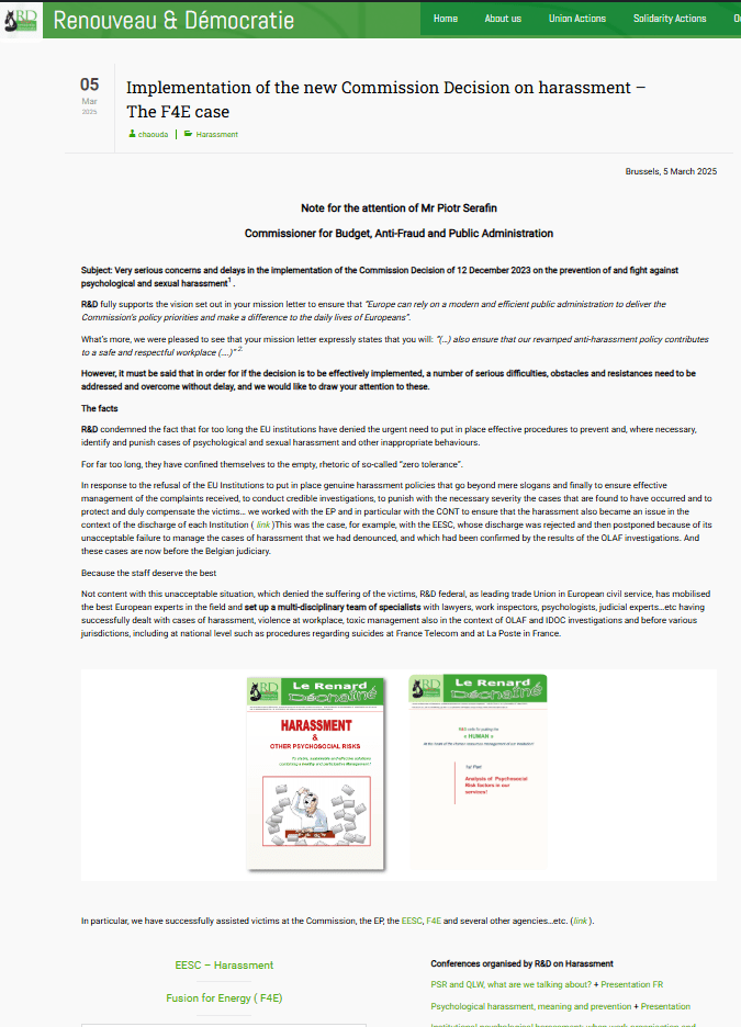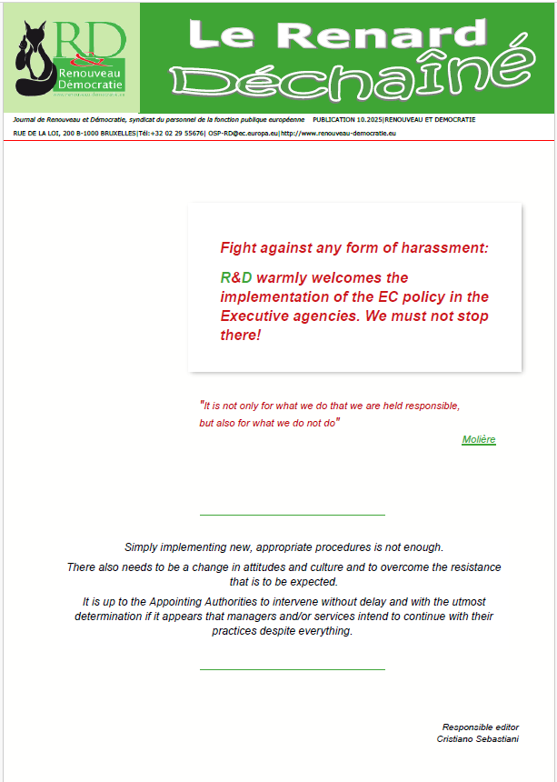 On this basis, R&D drew up its proposal for reforming procedures to combat all forms of psychological and sexual harassment, which was subsequently successfully negotiated with the Commission in the greatest unity of action in staff representation and in close cooperation with the staff representatives and the Harassment Watch Network, whose collaboration was absolutely essential.