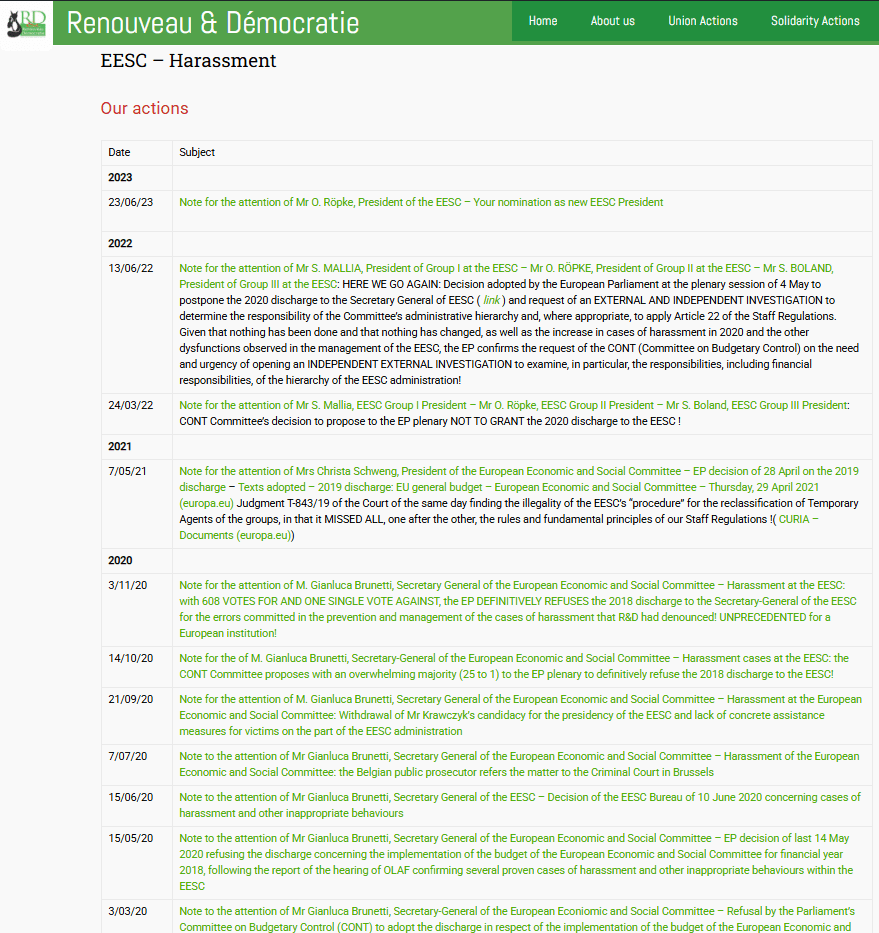 This was the case, for example, with the EESC, whose discharge was rejected and then postponed due to its unacceptable inability to handle the cases of harassment that we had reported and which had been confirmed by the results of OLAF investigations. These cases are now before the Belgian courts ( link ).