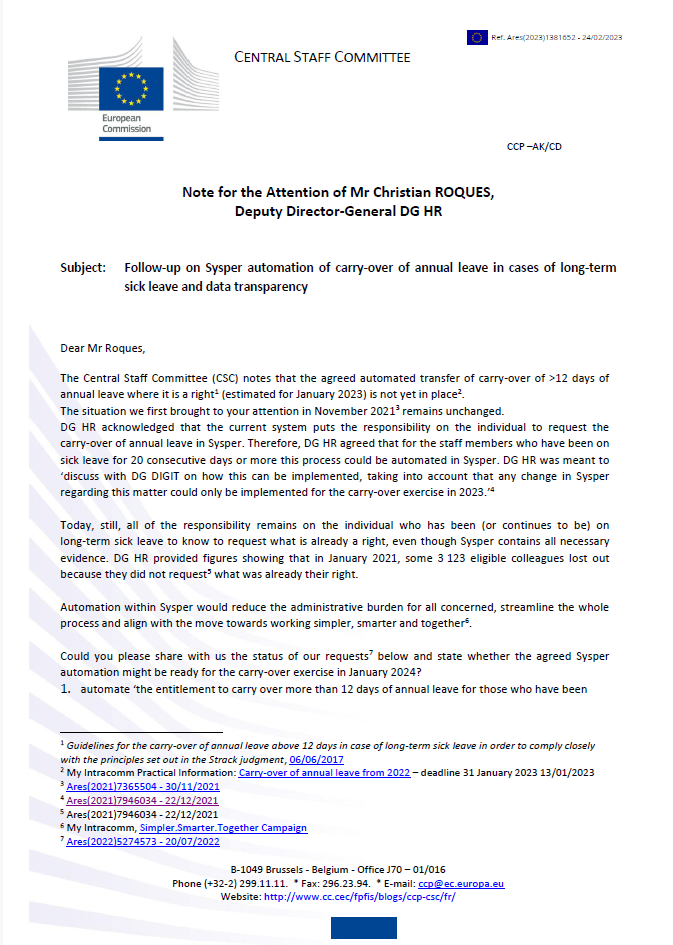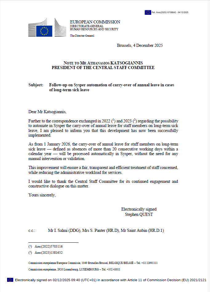 With the letter Ares(2025)10708842, DG-HR responded to the continuous requests of the Central Staff Committee (dating back to 2022 – Ares(2022)5274573 and Ares(2023)1381652) that “As from 1 January 2026, the carry-over of annual leave for staff members on long-term sick leave — defined as absences of more than 20 consecutive working days within a calendar year — will be processed automatically in Sysper, without the need for any manual intervention or validation”.