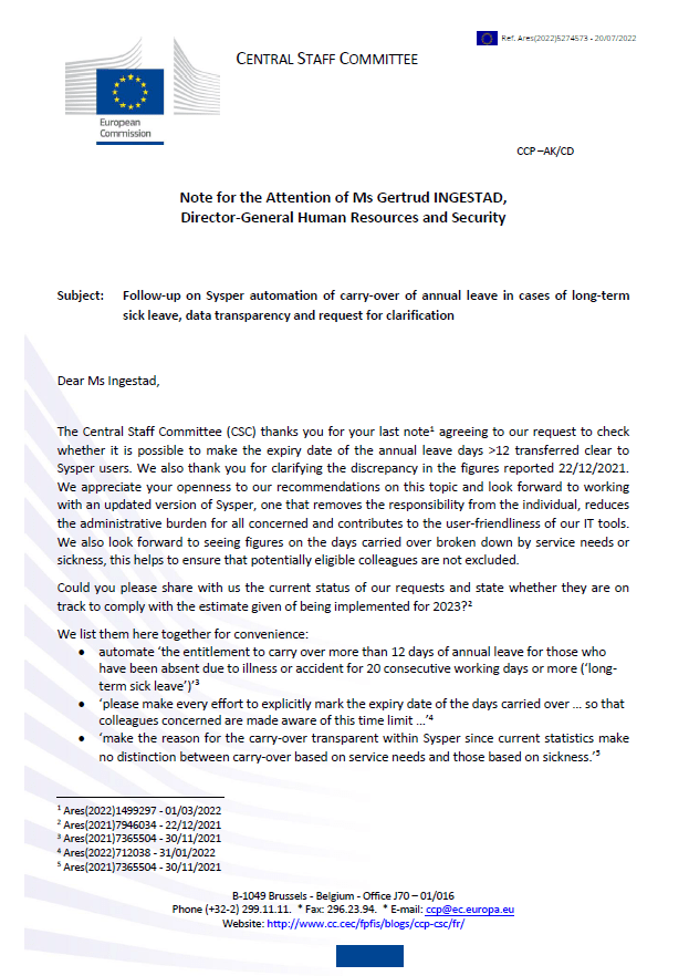 Another win of the Central Staff Committee as the administration finally puts in place the long-awaited carry-over automation for more than 12 days of annual leave, for colleagues who had been on long sick leave!