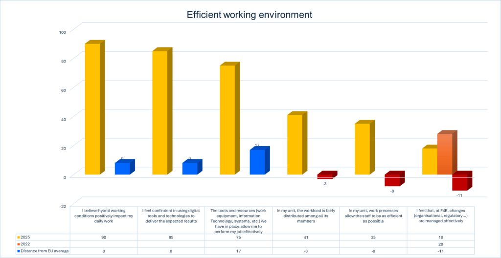 • · “In my unit, work processes allow staff to be as efficient as possible”: only 35% of respondents express satisfaction, with a –8 percentage point gap compared to the EU average, suggesting structural inefficiencies that may contribute to frustration and overload.