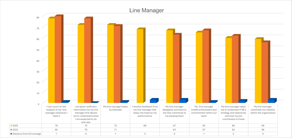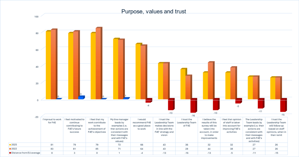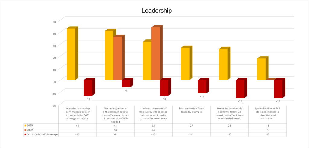• · The Leadership Team leads by example (i.e. their actions are consistent with their messages and with F4E’s activities)”: despite an already very low satisfaction rate in 2022 (27%), no progress whatsoever has been achieved in 2025. The gap with the EU average remains substantial at –11 percentage points, confirming staff perceptions that leadership behaviour does not align with declared values or priorities.