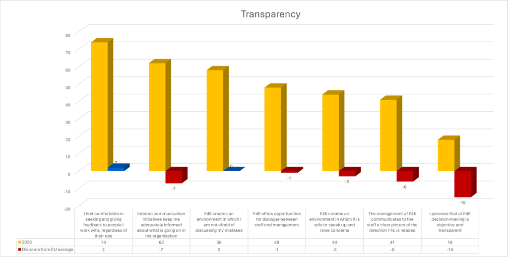 • · “I perceive that decision-making at F4E is objective and transparent”: this is by far the most critical result. With a mere 18% satisfaction rate and a gap of –15 percentage points below the EU average, it highlights a deep-seated perception of opacity and arbitrariness in decision-making processes.