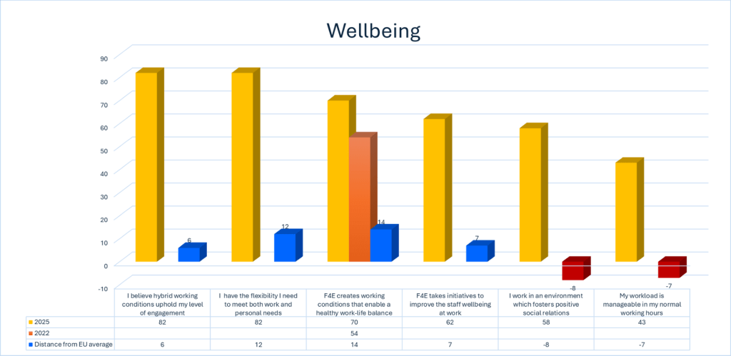 The introduction of hybrid working has provided F4E staff with greater flexibility and has contributed positively to work–life balance. This represents an important protective factor for well-being.